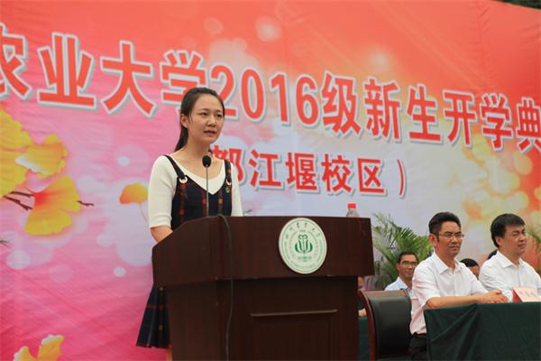 教师代表,以色列本古里安大学博士后、2015年学校引进优秀人才、2016年国家自然科学基金青年科学基金项目获得者、水利水电学院王莹博士,2016年国家自然科学基金优秀青年科学基金项目获得者、博士生导师、林学院吴福忠教授,2016年学校本科课堂教学质量奖特等奖获得者、建筑与城乡规划学院侯超平老师代表全校教职员工向新同学的到来表示热烈欢迎。他们以自己的成长经历告诉大家,未来文盲是没有学习能力的人,要保持好学的状态,不断向未知领域去探索,不忘初心,通往直前。