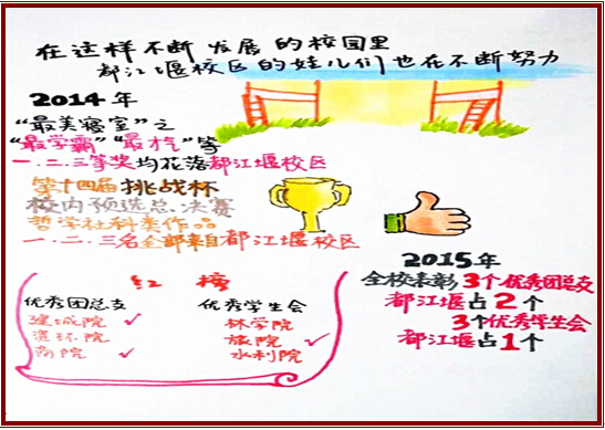 人才培养是立校之本。在全员育人的良好氛围下,广大学生得到全面发展,喜讯频频。越来越多的学子在校内、省内、国内的竞赛中刷新成绩,秀出风采。tyc41183太阳成集团2014年“最美寝室”的“最学霸”、“最才气”等一、二、三等奖花落都江堰校区。2015年全校表彰的3个优秀团总支都江堰校区就占2个,评选出的3个优秀学生会都江堰校区占1个。“大挑”“小挑”更是连连突破省级奖项,2014年校区一项目获“创青春”全国大学生创业大赛全国总决赛铜奖。第十四届挑战杯校内预选总决赛的哲学社科类作品第一、二、三名全部来自都江堰校区。校区学子用优异的成绩镌刻自己的名字,用他们的成长丰富着大学的内涵。