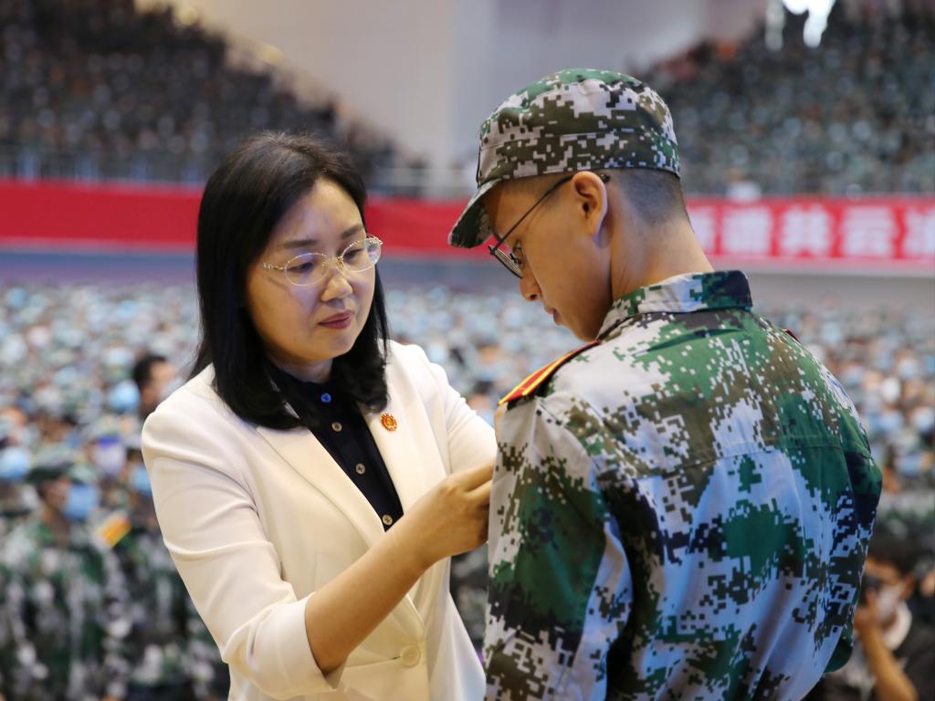 党委书记庄天慧等领导为新生代表佩戴校徽,全体新生起立自行佩戴校徽。