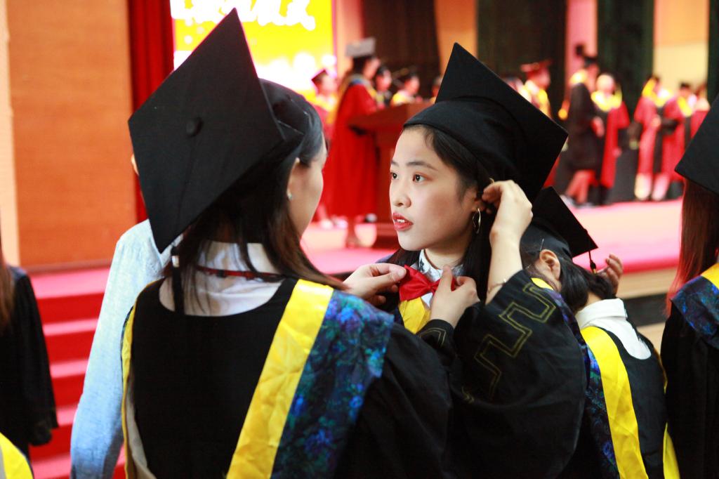 快要上台授位了,小姐妹相互整理着装,既紧张又激动