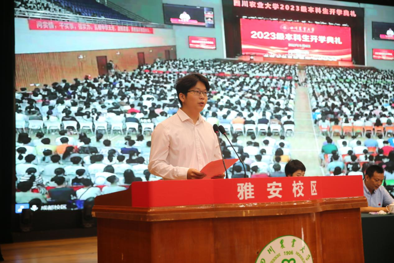 教师代表、国家优秀青年科学基金获得者、博士生导师、国家重点实验室黄永财教授从来到川农大求学求知、成长成才的故事出发,分享自己10多年来致力于农业科技创新,并在Nature、Plant Cell等全球顶刊发表高水平论文的故事,鼓励同学们珍惜在校时光,不断奋斗向上,书写属于自己的绚烂人生篇章。黄永财真挚而热烈的发言,让许多2023级新同学备受鼓舞。典礼结束后,众多新生激动地迎上去与他交流,表示一定向榜样看齐,脚踏实地、奋发有为,在川农挥洒青春汗水。