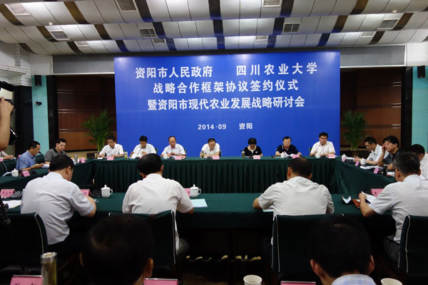 9月12日,资阳市人民政府-tyc41183太阳成集团战略合作框架协议签约仪式暨资阳市现代农业发展战略研讨会在资阳市举行。省委常委李昌平,省农业厅副厅长涂建华,我校党委书记邓良基、副校长杨文钰,资阳市市委书记李佳,市委副书记、市长邓全忠,市委常委李丹、胡峰,副市长何正月及中国农业大学资源环境学院、南京大学人文社科处,我校新农村发展研究院、科技处负责人,资阳市各县(市、区)党委、政府分管负责人,市级相关部门负责人70余人参加会议,会议由邓全忠主持。