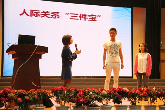 讲座的主题是“大学生进入大学学什么、怎么学、以及如何融入大学生活”。李东林用了四个“learn”来讲解“学什么”的问题,即“learn to learn,learn to do,learn to together,learn to be”(学会学习,学会做事,学会与人交往,学会做人)。而关于“怎么学” 她则引用今年优标李鹏程的一段微博,强调了制定学习目标与学习计划的重要性。就“如何融入大学生活” 她从“心理、学习、人际关系、经济”四方面来举例说明。介绍到适应人际关系时,她邀请了两位同学上台演示人际关系的“三件宝”---微笑、赞美、尊重。