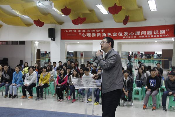 2014年4月10日,由都江堰校区学工部主办,校区学生就业服务中心承办的以“心理委员的角色定位及成长”为主题的心理健康教育活动在学生素质文化中心举行。学校心理健康教育中心欧居湖老师担任主讲。