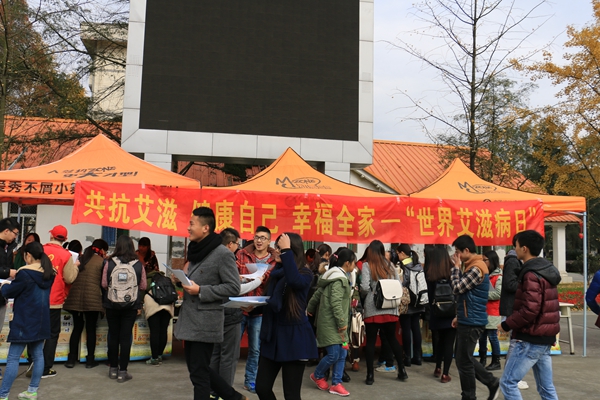 都江堰市防治艾滋病工作委员会办公室与校区医院给来往同学进行艾滋病的专业讲解,活动中志愿者们通过戴红丝带、向艾滋病人祈福、发放宣传资料和安全套、播放宣传片、签名承诺、网络宣传、有奖竞答等形式进行防治艾滋病宣传。让同学们了解相关知识,建立正确的防治艾滋病意识。