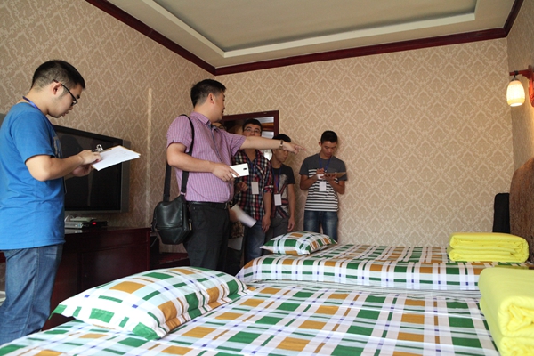 学院及部门负责老师、公寓管理人员、教官、宿舍管理委员会的同学们组成的“检查团”分成4组,来到一栋、六栋、九栋、十栋等新生住宿楼检查学生内务情况。新生宿舍内,地面干净整洁,被子统一叠成“豆腐块”,物品摆放有序,银杏宾馆改成的十栋宿舍也显得明亮温馨。