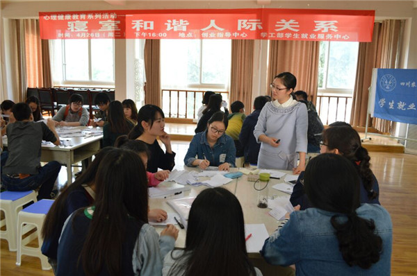 4月26日下午,由都江堰校区学生就业服务中心举办的心理健康教育系列沙龙——“寝室和谐人际关系”在校区创业指导中心举行。本次沙龙邀请了校区心理辅导老师何玲与同学们一起共同讨论了构建和谐寝室氛围的问题。