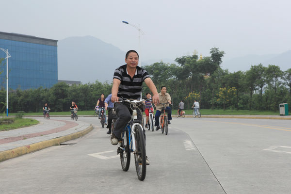 参加活动的教职工在活动中心前集合后,校区工会办公室负责人向参加骑行活动的教职工简要介绍活动的目的、骑行路线、注意事项等。随着负责人一声令下,骑游队伍在欢快的气氛中出发。骑游队伍沿校区北门干道、灵岩河、国宴宾馆、外北街延线、铁桥、进入工业园区往返近15公里,沿途观赏了都江堰五年来灾后重建的成果,感受了大自然美景。