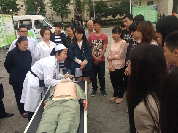 5月20日下午,由都江堰校区医院主办,都江堰平义社区卫生服务中心及学生红十字小分队(校区团委青年爱心协会)承办的“普及大众自救互救”主题急救演练在校园LED大屏幕前举行。本次活动主要由平义社区卫生服务中心副院长兰涛主讲,外科医生罗锋和护士长仰红操作演示,希望通过讲,演,练三者结合,全方位多层次地让同学们学习目前急需在我国青少年中普及的心肺复苏术和骨折外伤处理。医生们精彩的讲演获得了在场同学们的阵阵掌声,在医生讲解演练完毕后,同学们也踊跃上阵参加演练,在医生们的指导下,初步掌握了基本急救技能,同时也对本次活动的意义有了更深的领会。