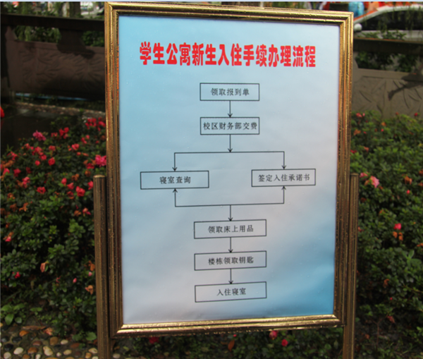 清晰的住宿流程办理图让新生和家长可以很轻松、快捷的办理好公寓入住手续。在学校的主干道上,也有“公寓入住手续办理由此去”的提示牌,通往寝室的路上,去往各栋新生宿舍的路线标志也简洁明了。