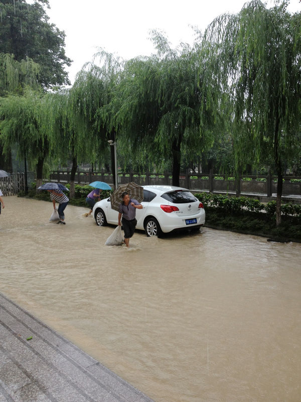 7月8日晚9点——9日中午,都江堰市遭遇暴雨侵袭,山洪不断涌入校园,杨柳河水从排水口漫出,在校园内形成短时积水。校区后勤服务公司员工与校区机关相关部门一起参与抗洪救灾,冒雨 “阻击”洪水,第一时间巡查商学院、教学楼、学生食堂等受灾地点,实地查看道路排水和房屋渗水情况,指导抢险人员及时抢险排危,并采取措施做好防洪工作。