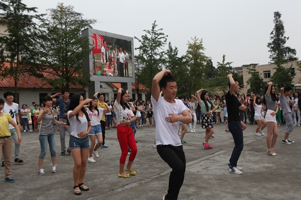 舞蹈《小苹果》是都江堰校区团联、团委直属部门、大学生艺术团为迎新特地编排的舞蹈,30多位同学28号就提前到校,连续两天录制了《小苹果》的欢迎视频,迎新时在LED屏幕上滚动播放。为了准备这场“快闪”,同学们今天上午还抽出时间再次排练。