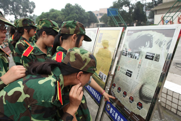 会议结束后,新生们以军训营为单位参观了全民禁毒暨合成毒品图片展和毒品展,都江堰市公安局禁毒大队相关人员向同学们详细介绍了在我国经常被滥用的毒品鸦片、吗啡、海洛因、杜冷丁、摇头丸等14类合成毒品,并详细介绍了毒品的危害。