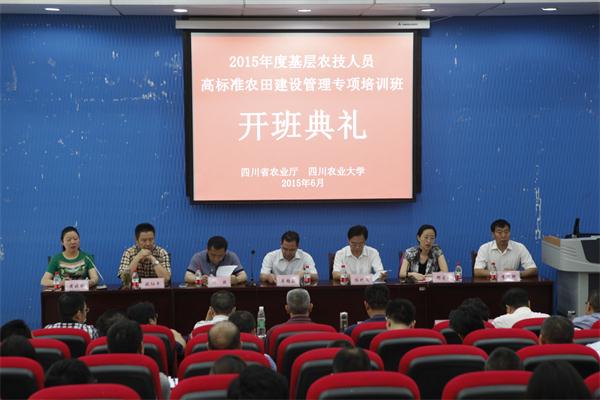 6月24日上午,四川省2015年度基层农技人员高标准农田建设管理专项培训班开班仪式在都江堰校区举行。省农业厅副厅长牟锦毅、省农业厅土壤肥料与资源环境处处长张熙、省农业厅科教处副处长邓爱群、成都市土壤肥料测试中心主任欧阳平,我校副校长陈代文、都江堰校区校长李廷轩、远程与继续教育学院院长黄晓俐与培训班一期160余名学员一同出席了开班仪式。仪式由黄晓俐主持。