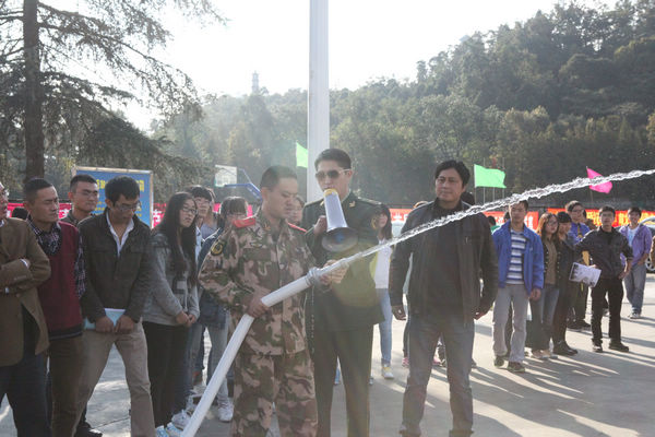 随后,在活动中心和LED前进行消防实战演练,参加活动的师生在相关老师的指挥下通过通道快速疏散到活动中心前。吴参谋为师生们现场讲解灭火器、消防栓、消防水带及消防水枪的使用方法,部分师生还在消防战士的指导下进行实战练习。