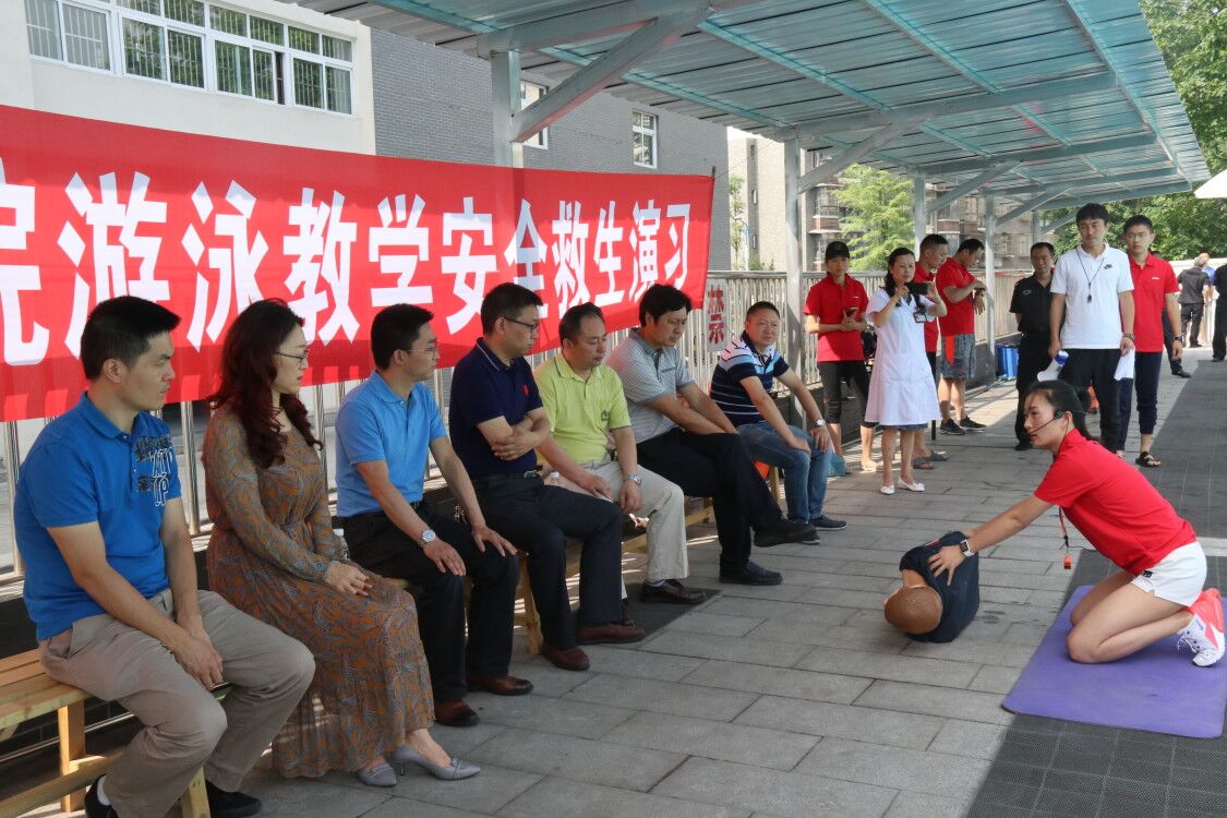 6月13日上午,商学院在校区游泳池举行游泳救生安全演练,院长符刚、党委副书记秦之香、副院长王冲,学院行政办及校区保卫部、教务部、校区医院相关负责人以及全体体育老师参加了演练。