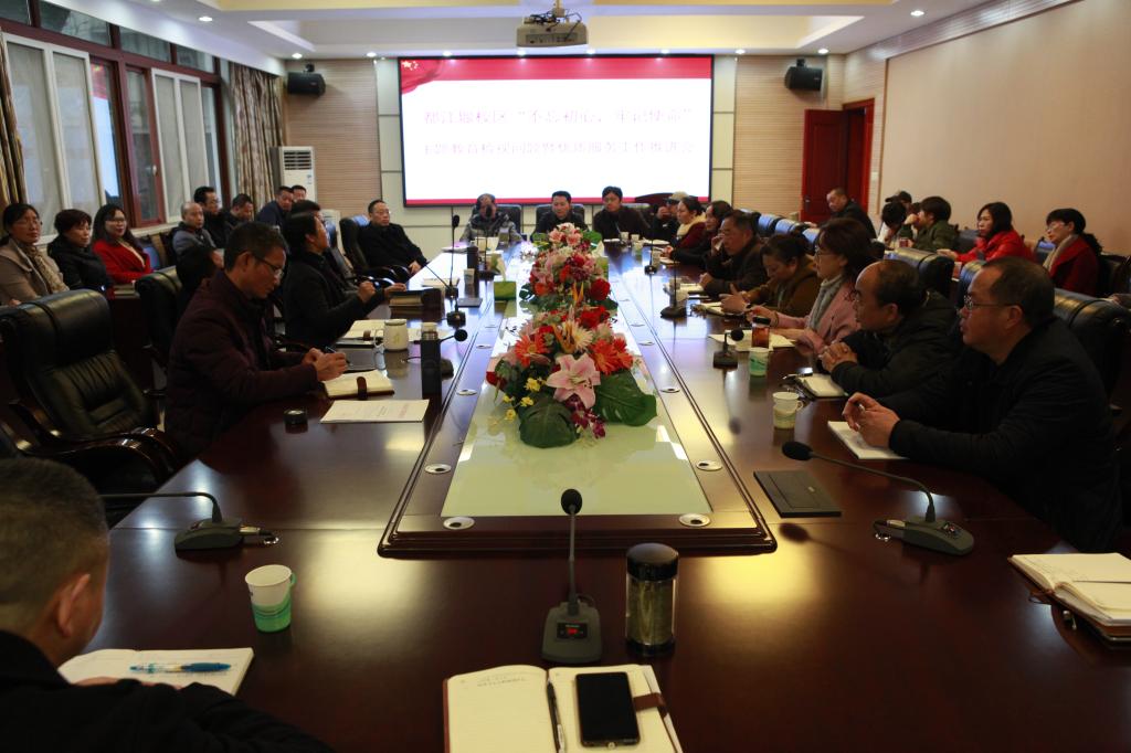 11月29日上午,都江堰校区在5304会议室召开“不忘初心、牢记使命”主题教育问题检视整改暨优质服务工作推进会。校区领导班子、全体科级干部、各支部支委成员和各部门服务管理人员参会。
