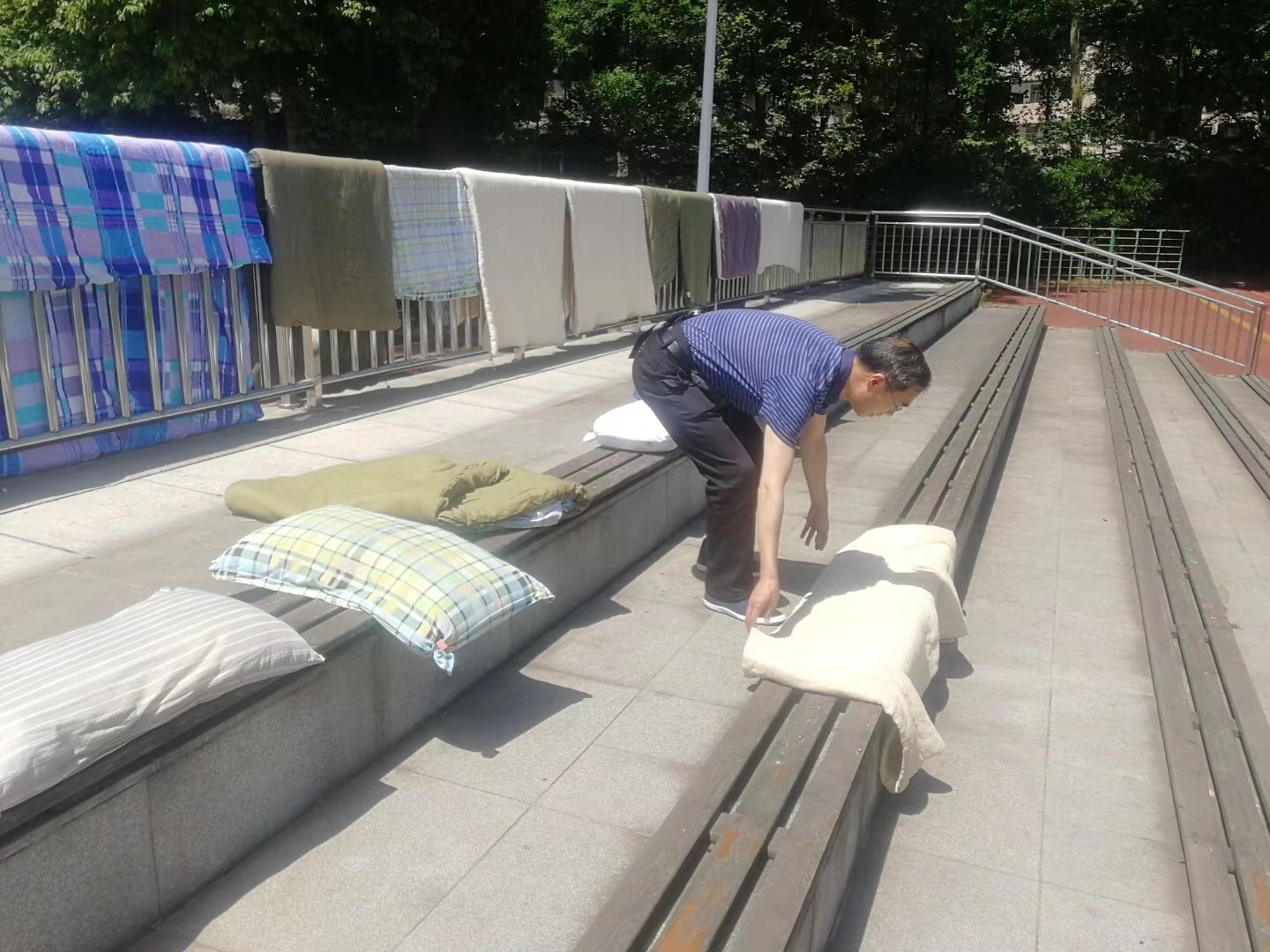 在橙色高温预警的提示下,老师们冒着炎炎烈日,分为三组,一组成员根据返校学生名单进入学生宿舍;二组成员在操场准备“晒场”。平时循循善导的师者,从踏入宿舍开始,就像刚送新生到校的家长忙前忙后,从开窗通风、确定床位号、做好标识、搬动被褥,处理被老鼠“光顾”的零食等,每一处细节都彰显着老师们的细致与爱心。在大家的努力下,上百床做好标记的被子很快就“集结”完毕,到烈日下与太阳"亲密接触"。第三组成员,则在为返校学生装配返校“小礼包”。考虑宿舍长时间无人居住,返校时间正值夏季,小礼包内准备了驱虫除味的香囊,消毒洗手液等,待第二批学生返校完毕后,教师代表与班主任们将一同前往宿舍分发。