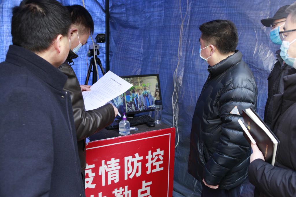 李川虎一行来到校区大门,在门卫疫情防控执勤点检查校门管控流程,仔细查看出入登记册、个人健康承诺书等资料。