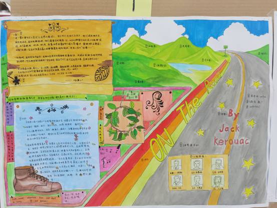 同学们选读推荐了《红星照耀中国》、《活着》、《追风筝的人》等红色经典文学、以及国内外文学经典书籍。在“阅百年经典,绘今朝思悟”手抄报比赛中,同学们以图文并茂的形式绘制读书心得,他们或临摹书本中最经典的角色,或抽象书中最核心的意象,或摘抄经典段落,或结合自身谈及个人读书体会,还原经典,分享感悟。在“为爱执笔,见字如面”情景荟萃活动中,同学们向心爱的书中人物撰写表白辞,与经典之作为伴,以书中人物为友,跨越维度的交流激发了同学们的读书热情。在“书中万象,笔下千景”改编创作活动中,同学们调动奇思妙想,或为故事改编新的结局,或为书中人物设计形象,让书籍焕发出崭新的生命力。