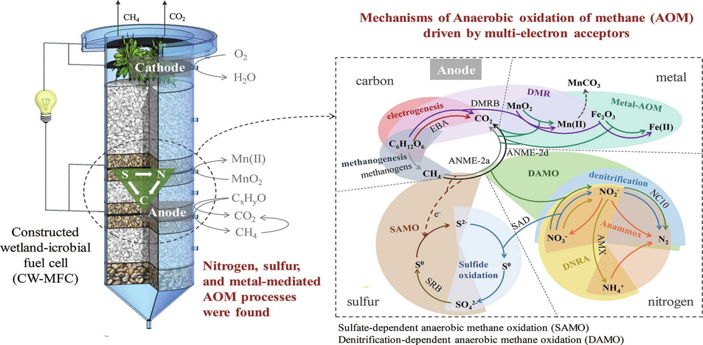 团队研究成果相继以“Anaerobic oxidation of methane (AOM) driven by multiple electron acceptorsin constructed wetlandand the related mechanisms of carbon, nitrogen, sulfur cycles”(多电子受体驱动的甲烷厌氧氧化在人工湿地减排及相关碳氮硫循环机制)为题发表在《ChemicalEngineeringJournal》(中科院1区Top,影响因子13.273),土木工程学院硕士研究生吴香伶为第一作者,张可副教授为通讯作者。以“Performance on horizontal flow and folded plate denitrification bioreactor recycling waste sawdust and municipal sludge for continuously treating simulated agricultural surface runoff”(利用废弃木屑和市政污泥构建的水平流和折板流脱氮反应器连续处理模拟农业地表径流效能研究)为题发表在《Journal of Cleaner Production》(中科院1区Top,影响因子9.297),土木工程学院硕士研究生庄戴维为第一作者,罗鸿兵教授为通讯作者。