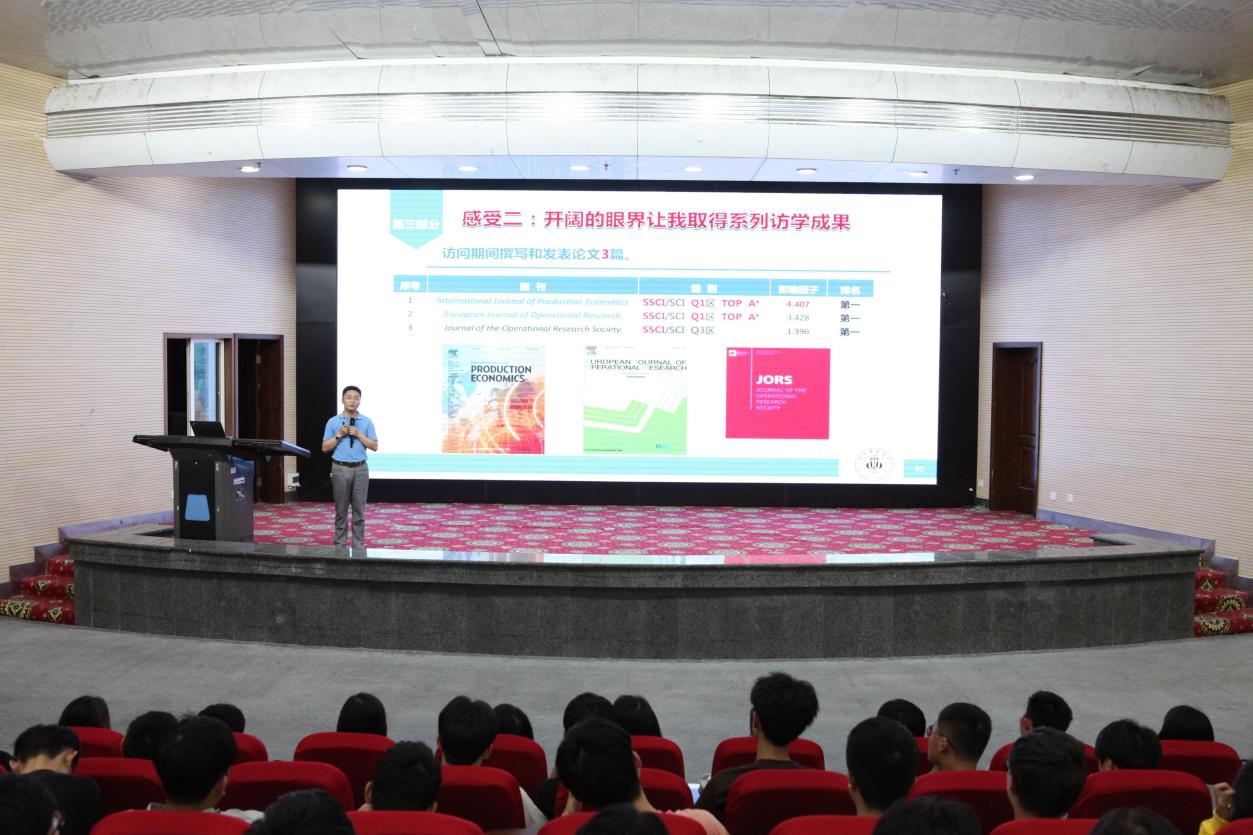 王冲教授从自身的访学申请过程、日常生活和研究学习等方面分享了访学经历,从祖国强大给予访学经济支持、开阔眼界取得系列成果、留学报国青春之光因奋斗而闪耀等方面畅谈了自己的访学收获和感受,引导青年学子们要具有爱国之心、感恩之情、奋斗之志。最后为激发青年学子们爱国报国的使命情怀,王冲借用习近平总书记给莫斯科大学中国留学生回信中的一段话勉励青年学子,希望大家弘扬留学报国的光荣传统,胸怀大志,刻苦学习,早日成长为可堪大任的优秀人才,把学到的本领奉献给祖国和人民,让青春之光闪耀在为梦想奋斗的道路上。