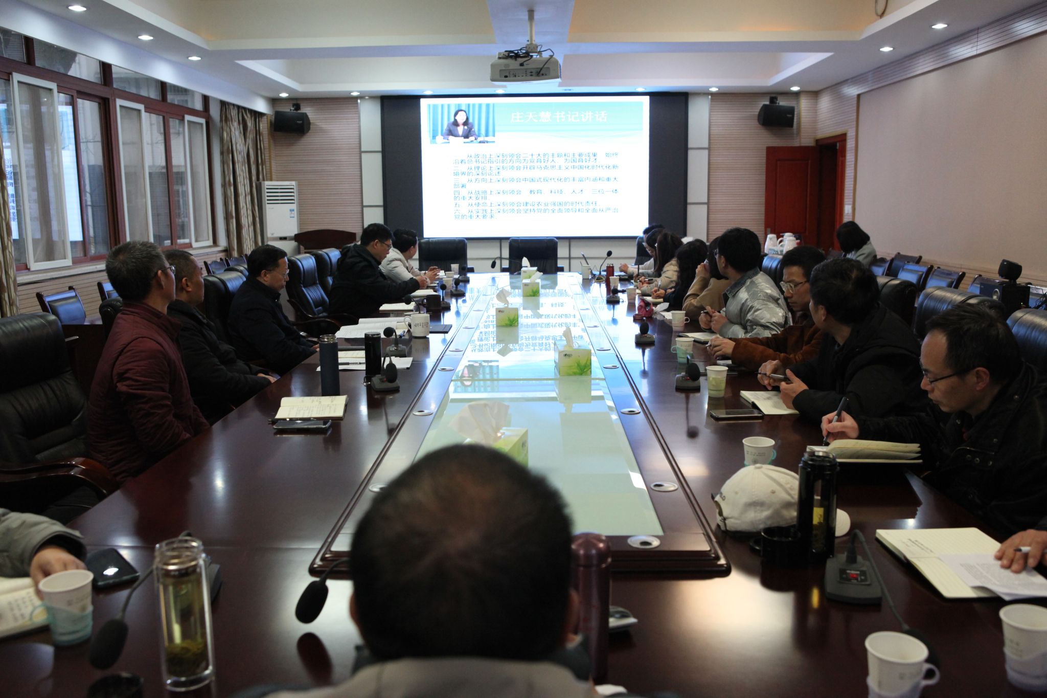 会议传达了学校党委中心组(扩大)暨中层领导干部会精神,重点对学校党委书记庄天慧就如何从六个方面深刻领会贯彻党的二十大精神、学校六项重点工作和五个紧盯不放要求,以及校长吴德对今年学校开展的三件大事、三件难事和三件实事等内容进行了传达。会前,全体参会人员还共同观看了学校2022年《奋发有为创新绩 拼搏实干向未来》年终总结记录片。