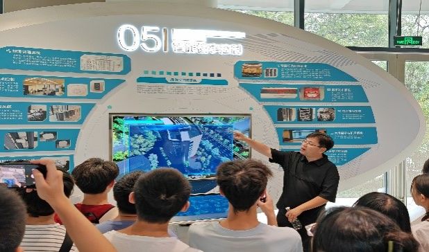 随后访学团来到建科院“绿色三星”建筑示范项目展厅,探秘西南首个“绿色三星”建筑——四川省建科院大楼。该楼始建于1985年,于2015年本着“节约资源、低成本、低能耗、精细化”的设计理念,因地制宜地采取BIM技术、被动式建筑节能设计、垂直+屋顶绿化、空气质量在线监测、雨水回收利用、太阳能光伏发电技术、智能灯光+空调控制系统、新风热回收系统、集成智能化系统、外窗外遮阳技术等十余项绿色节能改造,获得了西南地区国内首个“绿色三星”认证,这是国内的绿色节能建筑的“天花板”作品。