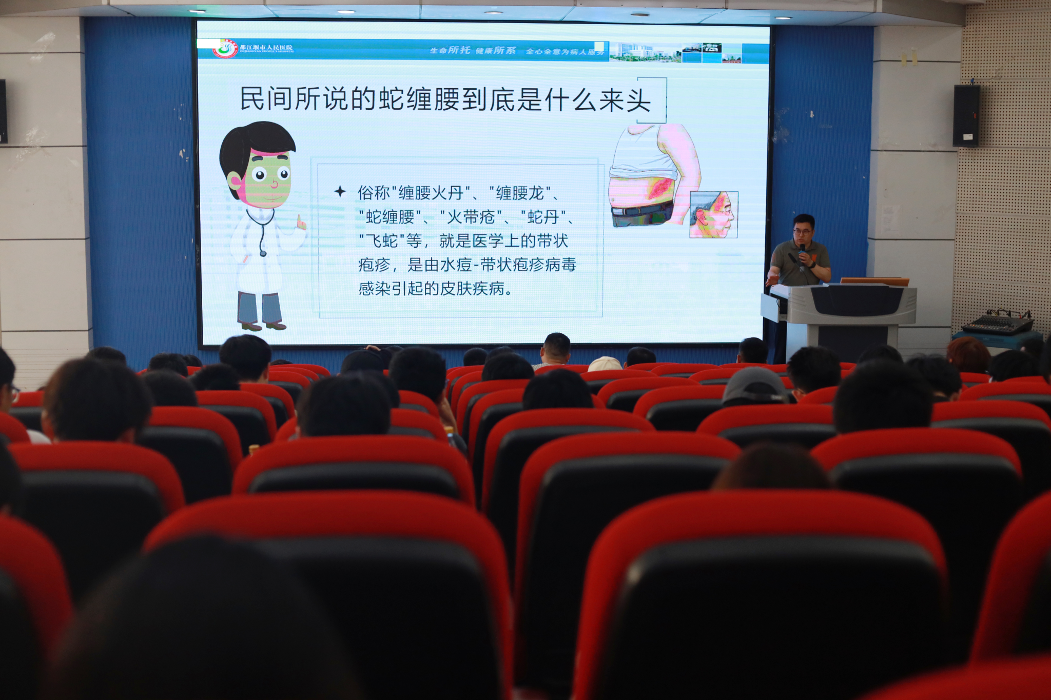 讲座邀请了都江堰市人民医院的三位专家主讲,他们分别从不同的健康话题切入,带来了丰富的知识和实用的建议。皮肤科的宁旭医生以“带状疱疹-民间说的蛇缠腰,缠了一圈就没命?”为主题,向大家科普了带状疱疹的相关知识。口腔科的宋成成医生以“爱护牙齿的那些事儿”为题,主要科普了口腔最常见的问题、口腔健康标准和口腔问题的预防等知识。宋医生从洗牙洁牙、预防虫牙和防止牙齿外伤等方面,深入浅出地介绍了如何保持口腔健康。康复科的樊斌医生主要分享了踝关节扭伤的康复策略,详细介绍了踝关节损伤的原因、临床表现、分级和康复治疗,他重点介绍和现场演示了几个常见的功能训练的方法,在场的同学们都纷纷跟着学了起来。