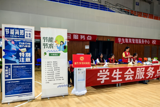 新生季期间,三校区分别在迎新点、食堂门口、主干道等多处摆放内容丰富的“节能十条倡议”和“节能简报”宣传展架。通过直观的图文展示,让同学们了解节能的重要性,学会节水节电小妙招。