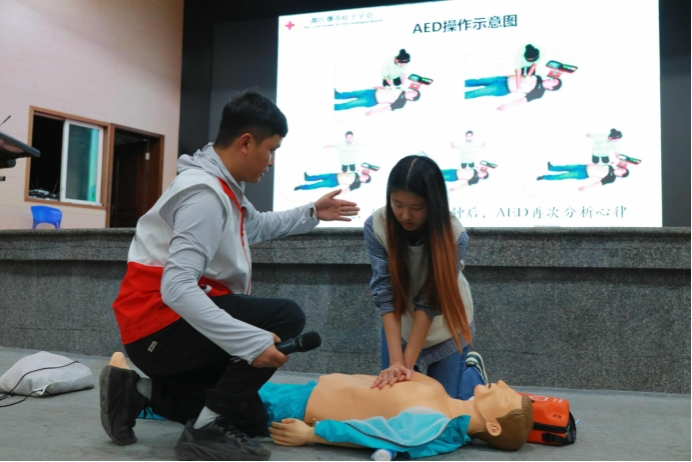 都江堰红十字会经验丰富的应急救护培训师李雷以真实案例为切入点,强调了“黄金4分钟”对心脏骤停患者的重要性。在心肺复苏(CPR)环节,他现场演示了复苏的整个流程,并重点讲解了按压深度、频率以及标准姿势的关键点。对于自动体外除颤器(AED)这一“救命神器”,李雷指出了其“开机即有语音指导”的智能化特点,并通过模拟设备指导学生完成除颤操作。海姆立克急救法的教学则采用“剪刀石头布”口诀来加强记忆,使得急救技能变得简单易学。