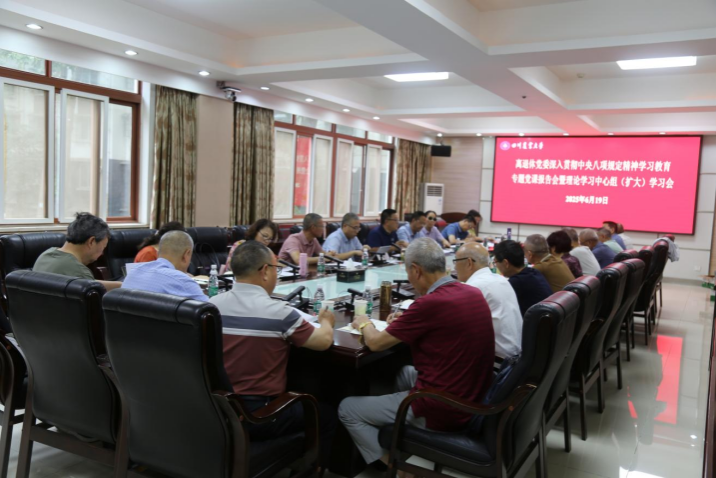 6月19日上午,离退休党委深入贯彻中央八项规定精神学习教育专题党课暨理论学习中心组(扩大)学习会议在都江堰校区召开,离退休党支部书记20余人及校区综管办负责人参加会议。会议由离退休处处长、党委书记冯未俊主持。