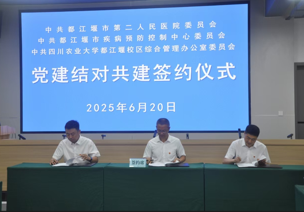 6月20日,都江堰校区综合管理办公室党委、都江堰市第二人民医院党委、都江堰市疾病预防控制中心党总支在都江堰市第二人民医院举行党建结对共建签约仪式。