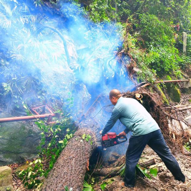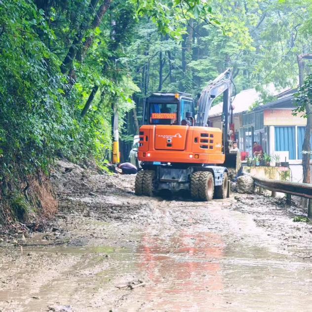 抢险现场分秒必争。“分段切割树干,挖掘机同步清淤!”指挥指令下达后,抢险人员分工协作:一组操作油锯,将粗壮树干拆解为小段;另一组配合橙色挖掘机,挖铲交替清理淤泥、搬运树段。属地部门全力支撑,协调1台挖掘机、2辆转运车持续作业,1辆洒水冲洗车,专人在入山口疏导周边交通。雨中奋战6小时,泥浆裹满裤脚,汗水混着雨水滴落,抢险队累计清理淤泥320余方,移除倒伏树木30余株,疏通道路260米,抢通林场“生命交通要道”。