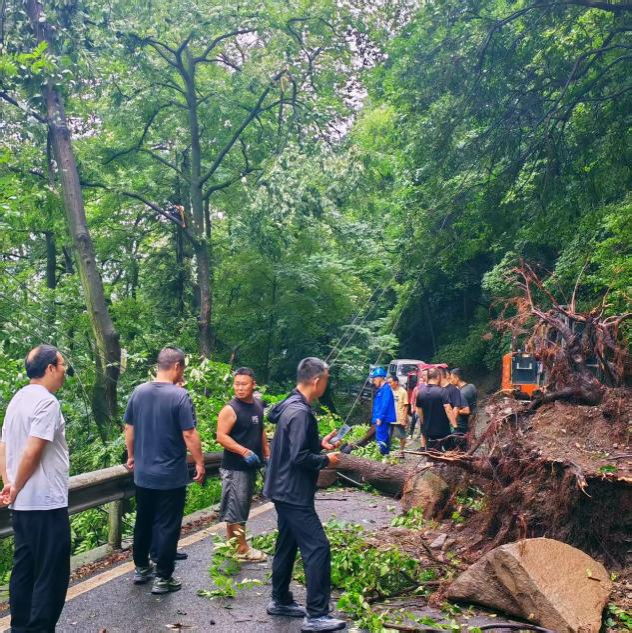 应急响应迅速启动。7月5日早晨6点都江堰校区综合管理办教学科研基地全体工作人员第一时间赶赴现场,调查掌握险情。同时组织专业人员,并联动属地灌口街道办、灵岩山社区、岷江水务、电力等部门一道,全力除险。综管办相关负责人到场督促指导,只见倒伏树木枝叶缠结,根系带起的泥土与路面淤泥黏连成片,机械作业空间逼仄;部分路段因滑坡出现路基坍塌,抢险难度陡增。