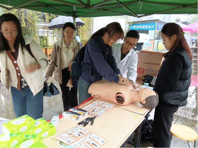 次日,为巩固宣传成效,后管科在活动中心旁特设立模拟实践宣传点。后管科医生和志愿者们耐心地给每一位参与同学指导操作要点,帮助大家反复练习,提升操作实效。“以前总觉得急救是医护人员的事,距离自己很遥远”,参与活动的王思雨同学分享道,“通过这次模拟实践体验,我不仅学会了急救技能,更重要的是消除了对实施急救的恐惧感。”