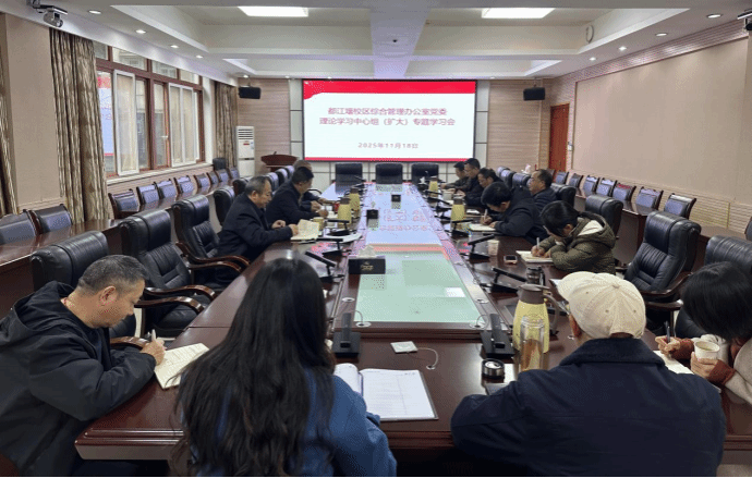 11月18日,都江堰校区综管办党委召开理论学习中心组(扩大)专题学习会,集中传达学习党的二十届四中全会精神和学校全面从严治党工作会精神,并要求认真贯彻落实会议精神、扎实做好近期工作。