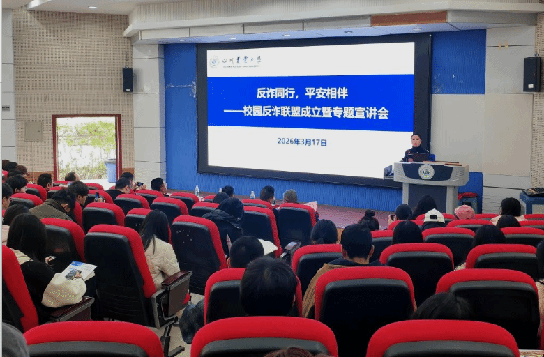 随后,都江堰市反诈中心民警张志豪进行专题宣讲。他以案说法,通过剖析网络刷单等8类校园常见电信网络诈骗典型案例,详细讲解作案手法与防范技巧,并结合相关法律,提醒同学们警惕高发诈骗及境外高薪陷阱,切勿沦为诈骗“工具人”,切实增强识诈、防诈、反诈能力。